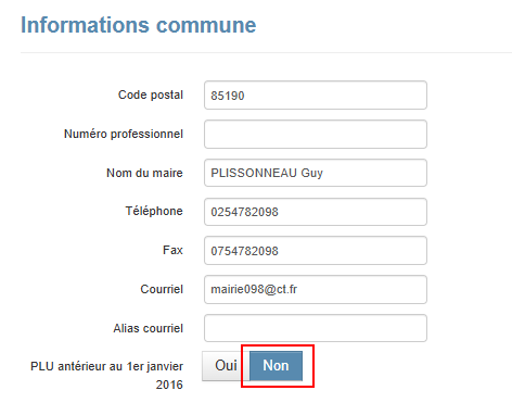 •Gestion des communes, édition des informations d'une commune - [Amélioration] - version 5.5.1 : le paramétrage "PLU antérieur au 1er janvier 2016" a été forcé à "Non" pour l'ensemble des communes. |