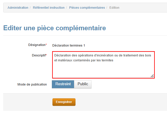 •Pièces complémentaires, descriptif - [Amélioration] - version 5.5.1 : le champ "Descriptif" devient éditable lors de l'ajout d'une pièce complémentaire personnalisée (et non plus uniquement en modification). |