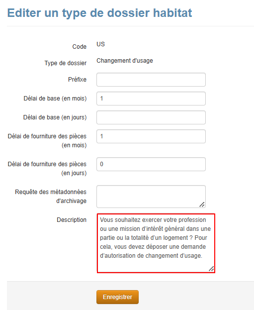•Spécificité Habitat - US, Changement d'usage - [Amélioration] - version 5.5.100 : ajout d'une description au type de dossier US ainsi qu'aux objets de demande liés. |
