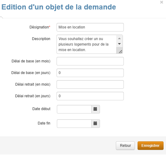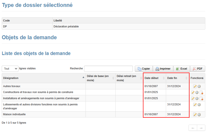 •Type de dossier, réformes associées - [Amélioration] - version 5.5.100 : suppression des fonctions [Réformes] au profit d'une date de début et date de fin au niveau des paramétrages des objets de demande et des décisions pour tous les types de dossiers, toutes catégories confondues. Ainsi, les éléments paramétrés sont visibles ou non dans les dossiers selon la période paramétrée et la date de dépôt de chaque dossier. |