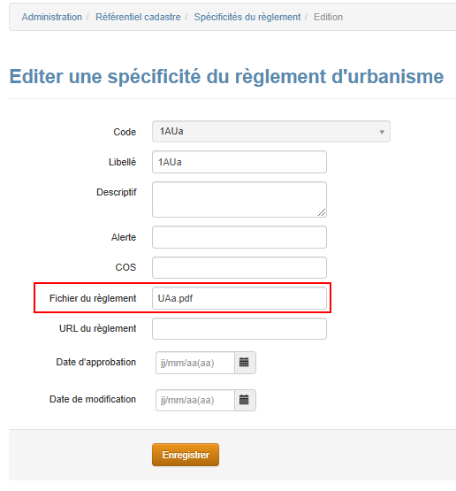 •Spécificités du règlement - [Amélioration] - version 5.5.1 : agrandissement du champ "Fichier" de 50 à 250 caractères dans le formulaire. |