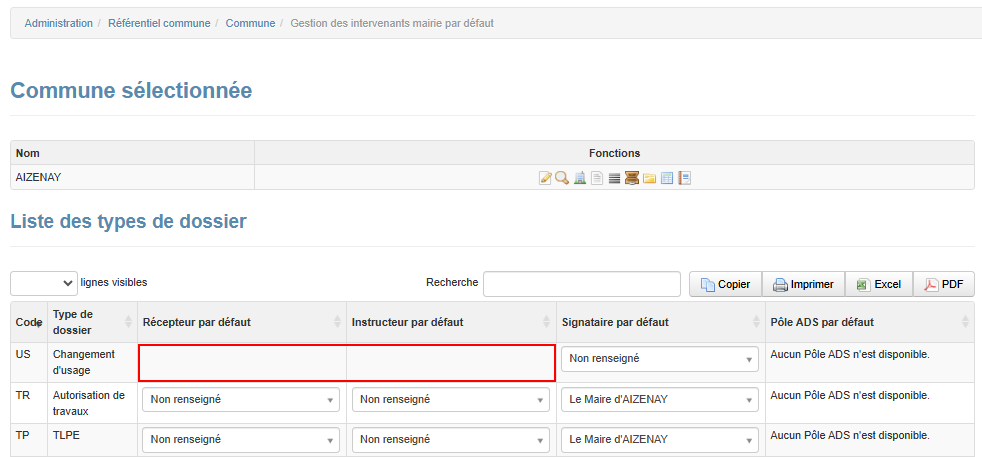 •Gestion des communes, gestion des intervenants par défaut - [Correction] - version 5.5.1 : le paramétrage d'un récepteur et d'un instructeur par défaut n'est plus disponible pour les dossiers DI et US. |