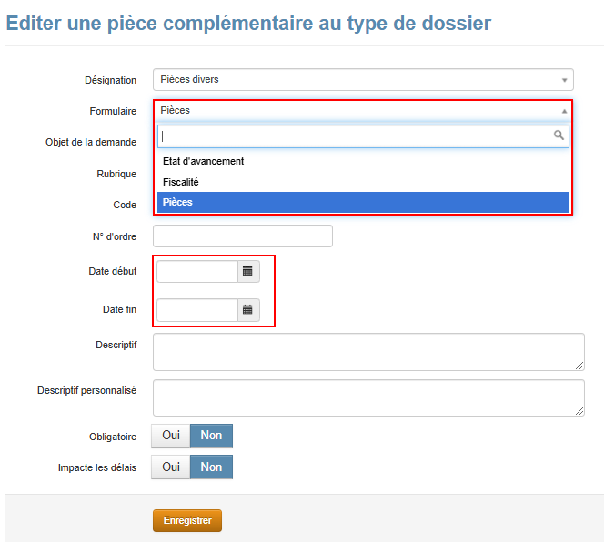 •Pièces complémentaires (par type de dossier), généralités - [Amélioration] - version 5.5.1 : ola liste Formulaire est positionnée par défaut sur la valeur "Pièces" lors de l'ajout d'une pièce complémentaire au type de dossier. ola liste Formulaire propose dorénavant la valeur "État d'avancement", permettant ainsi aux administrateurs d'ajouter des pièces personnalisées lors d'un état d'achèvement au niveau du formulaire État d'avancement dans le cas des autorisations. ola liste Formulaire est désormais adaptée en fonction du type de dossier sélectionné. Ainsi, seul le formulaire "Pièces" sera proposé dans le cas d'une DIA, à contrario d'un PC qui dispose des formulaires "Pièces", "Fiscalité" et "État d'avancement". ola fonction [Réforme] est supprimée au profit des champs "Date début" et "Date fin". Ainsi, les pièces paramétrées sont visibles ou non dans les dossiers selon la période paramétrée et la date de dépôt de chaque dossier. |