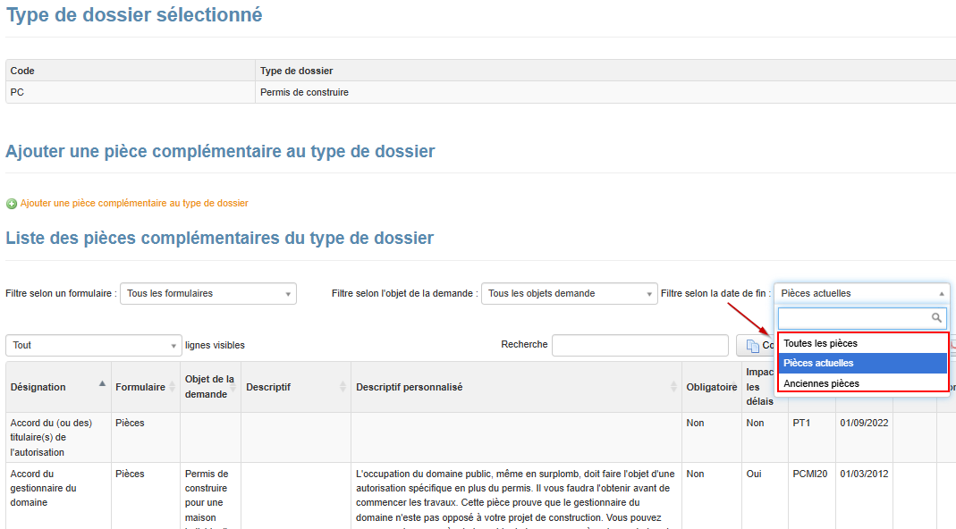 •Pièces complémentaires (par type de dossier), filtre - [Amélioration] - version 5.5.1 : ajout d'un nouveau filtre vous permettant de visualiser plus facilement les pièces paramétrées selon leurs dates de fin ("Toutes les pièces", "Pièces actuelles", "Pièces anciennes"). |