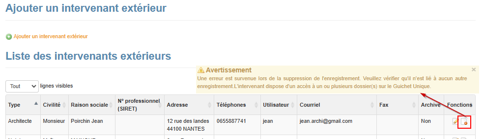 •Liste des intervenants, Suppression - [Correction] - version 5.5.100 : correction de la fonction [Supprimer] et amélioration du message d'avertissement lorsque l'intervenant extérieur dispose d'un compte sur le Guichet unique. |