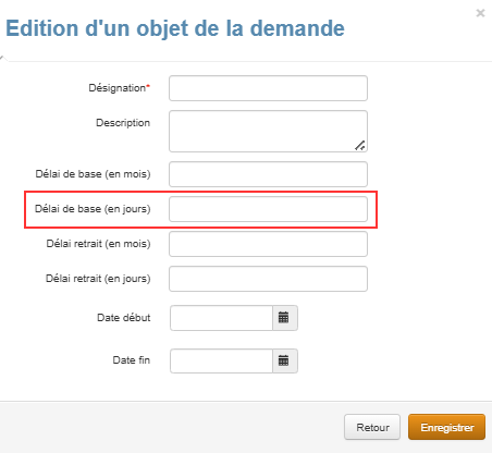 •Spécificité Dossiers divers, Objet de la demande - Gestion des délais - [Correction] - version 5.5.100 : le champ "Délai (en jours)" n'est plus caché lors de l'ajout d'un délai à l'objet de la demande. |