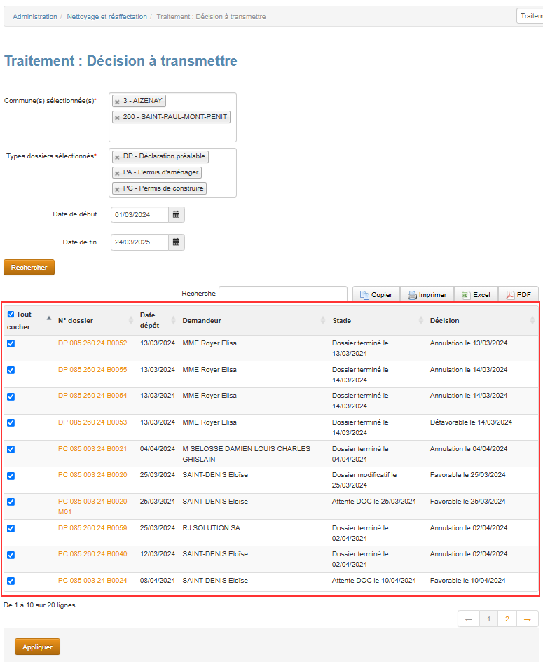 •Traitement : Décision à transmettre - [Correction] - version 5.5.100 : correction de la recherche des décisions à transmettre dans la section nettoyage et réaffectation de l'admin (les propositions de l'instructeur ne sont plus retournées). |