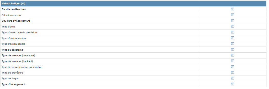 •Habitat (HI) - [Amélioration] - version 5.5.100 : ajout des listes de références spécifiques aux dossiers de type "HI" : Famille de désordres, Situation connue, Structure d'hébergement, Type d'acte, Type d'acte / type de procédure, Type d'action foncière, Type d'action pénale, Type de désordres, Type de mesures (commune), Type de mesures (habitant), Type de préconisation / prescription, Type de procédure, Type de risque et Type d'hébergement.
