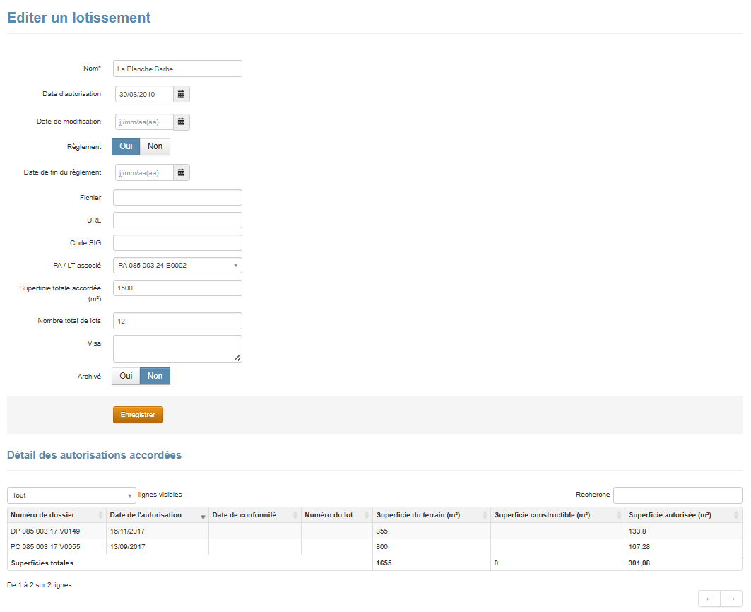 Le détail des autorisations (PC,DP) accordées sur le lotissement remonte automatiquement.
