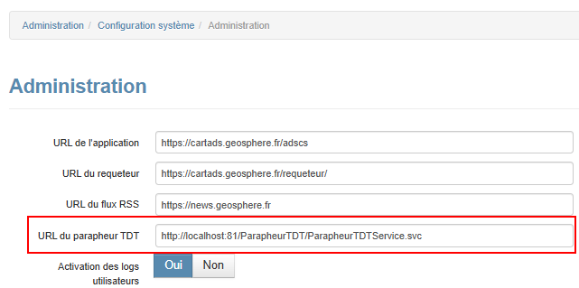 •Administration - [Amélioration] - version 5.5.100 : déplacement du paramètre technique "URL du parapheur TDT" dans le menu Configuration système\Administration. |