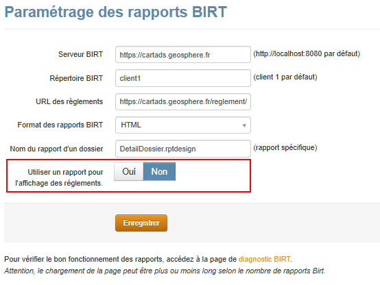 •Birt - [Amélioration] - version 5.5.100 : ajout d'un nouveau paramètre "Utiliser un rapport pour l'affichage des règlements." afin de pouvoir réactiver l'ancien rapport Birt d'affichage des règlements des parcelles dans le formulaire Désignation du terrain. |
