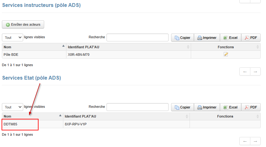 Exemple : Gestion des données PLAT'AU/ Acteurs - Service instructeur