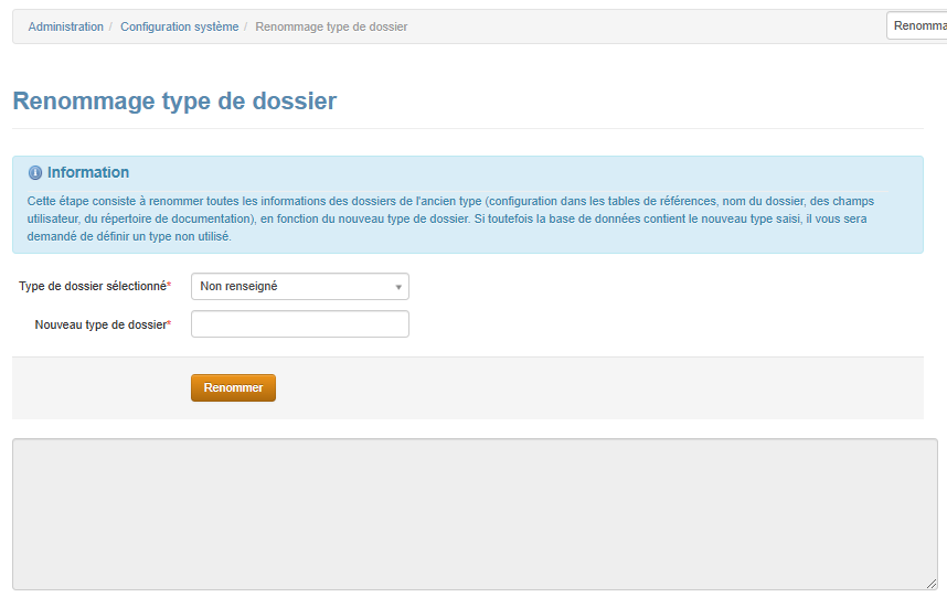•Renommage - [Amélioration] - version 5.5.100 : migration de la fonctionnalité de renommage d'un type de dossier divers de l'utilitaire CCS vers l'administration de Cart@DS CS (menu Configuration système/Renommage type de dossier). |
