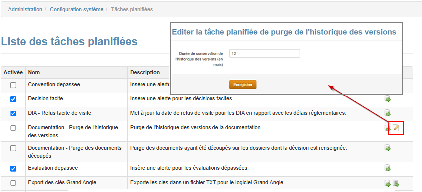 •Purge de l'historique des versions - [Amélioration] - version 5.5.100 : nouvelle tâche en lien avec le module GED-Document manager, qui permet de supprimer l'historique des versions de vos documents après un certain délai paramétrable (12 mois par défaut). |