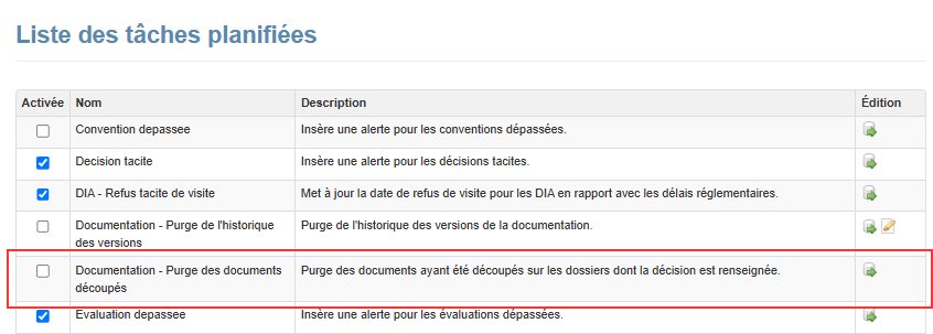 •Purge des documents découpés - [Amélioration] - version 5.5.100 : nouvelle tâche en lien avec le module GED-Document manager, qui permet de supprimer le document utilisé dans le découpage des pièces, une fois l'instruction terminée. Attention, cette tâche n'est pas rétroactive et ne concernera que les documents découpés à partir de la version 5.5. |