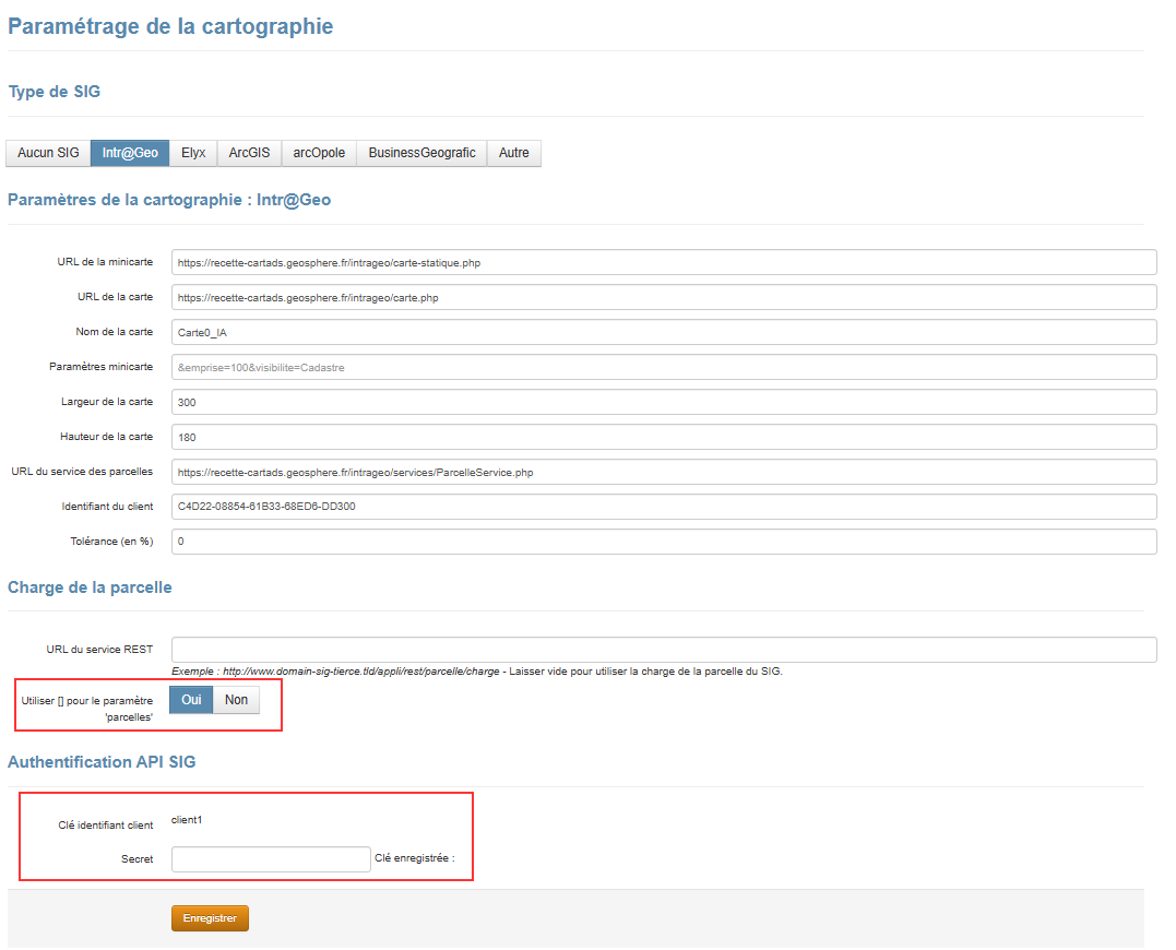 •Cartographie, généralités - [Amélioration] - version 5.5.100 : dans le cas de la configuration avec un SIG tiers, ajout de nouveaux paramètres concernant la charge de parcelle et l'authentification par API.