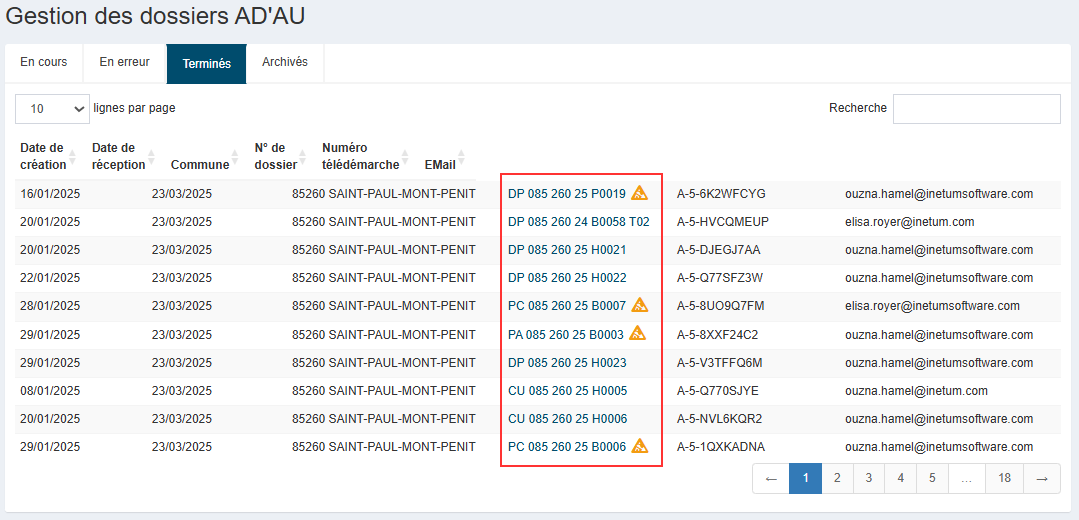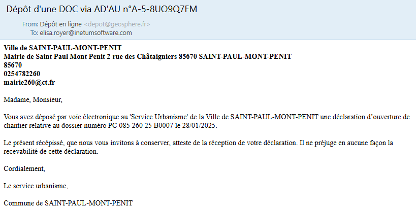 •Notification par courriel (Reporting - Récapitulatif dépôts en ligne) - [Amélioration] - version 5.5.1 : suppression du courriel récapitulatif listant les dossiers entrants via AD'AU par commune. |