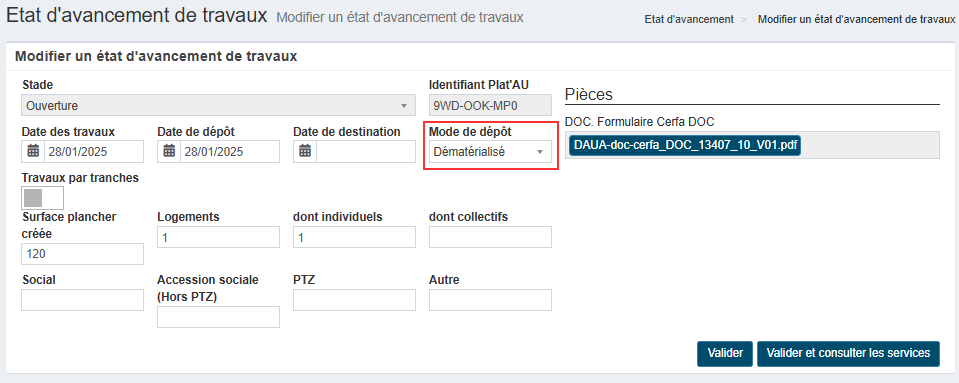 •Réception d'une DOC/DAACT et mode de dépôt - [Correction] - version 5.5.1 : le mode de dépôt des DOC et DAACT reçues par AD'AU est mis à jour avec la valeur "dématérialisé". |