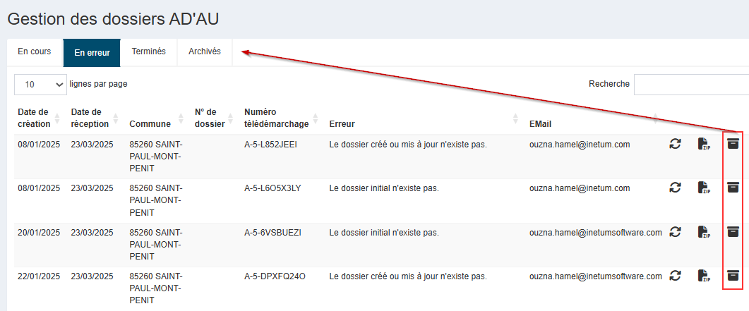•Gestion des dossiers AD'AU, Archivage - [Amélioration] - version 5.5.1 : les télédémarches AD'AU en erreur peuvent désormais être archivées. |