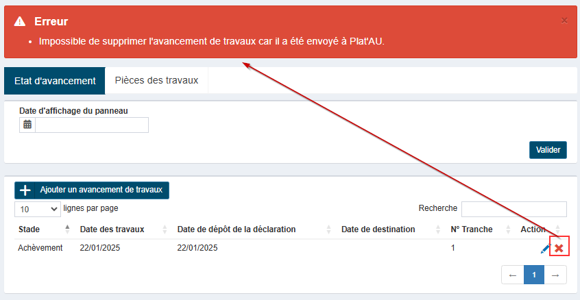 •Suppression d'une DOC/DAACT (contrôle) - [Amélioration] - version 5.5.1 : la suppression d'une DOC ou d'une DAACT n'est plus possible si cette dernière a été envoyée à PLAT'AU. |